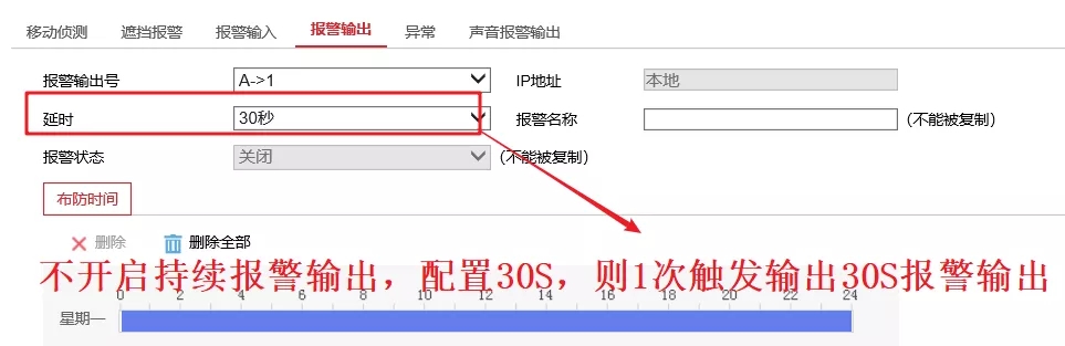 配置好报警次数和满足需要的外放音量。最后设置好布防时间(默认7 x 24h)。
